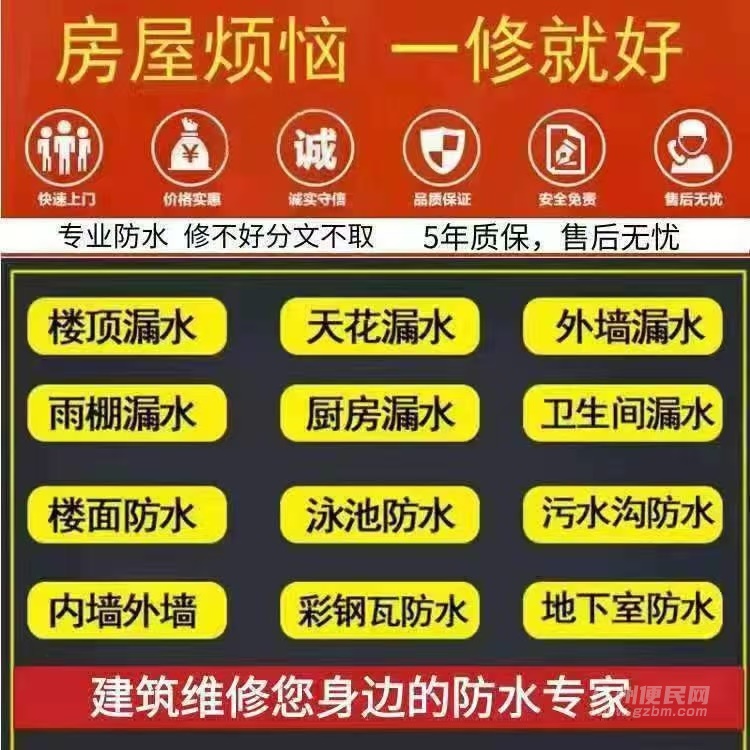 《防水补漏》楼房。平台。阳台。天沟。厨房。房屋顶。飘窗。卫生间漏水免敲墙,免砸砖,快速维修。钢结构漏水维修。漏水检测,暗管漏水检测,暗管道漏水精准定位,阳光房漏水维修。外墙渗水维修。厂房漏水维修。高压注浆。诚信服务。价格便宜。免费上门勘察。本人专注防水20年。承接各地区大小防水工程。